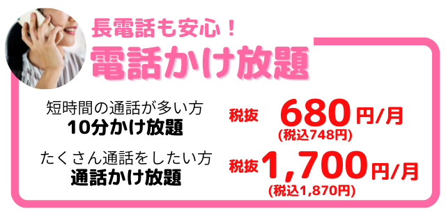 | 10分かけ放題 | 748円/月 | ・1回の通話が最大10分まで何度でも無料。10分超過後は11円/30秒の通話料が発生します。 |