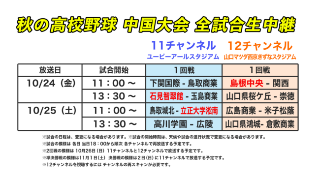 文字の大きさ標準大きい 秋の高校野球 中国大会の放送について 2025年10月24日 「秋季中国地区高等学校野球大会」の模様を雲州わがとこテレビで全試合生中継・当日再放送します。 詳細は、以下の通りです。 春の甲子園 出場を目指す高校球児の熱戦を是非ご覧ください。 Post navigation